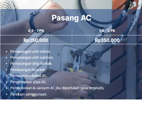 0,5 - 1 PK Rp400.00 1,5 - 2 PK Rp500.000 Pencopotan unit indoor & outdoor. Pencopotan pipa dan kabel jika memungkinkan. Teknisi akan membawa AC jika jarak tidak lebih dari 1 km. Pemasangan unit indoor. Pemasangan unit outdoor. Pemasangan stop kontak. Pemasangan bracket. Pemasangan kabel AC. Pengkonekan pipa AC. Pembobokan & vacuum AC jika diperlukan (jasa terpisah). Panduan penggunaan.