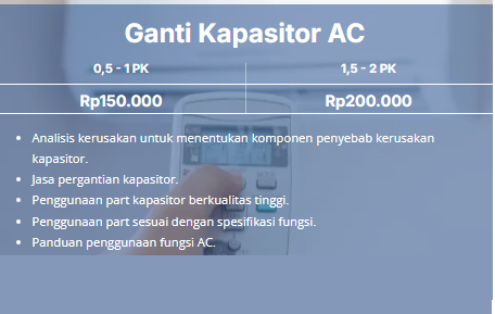 0,5 - 1 PK Rp150.000 1,5 - 2 PK Rp 200.000 Analisis kerusakan untuk menentukan komponen penyebab kerusakan kapasitor. Jasa pergantian kapasitor. Penggunaan part kapasitor berkualitas tinggi. Penggunaan part sesuai dengan spesifikasi fungsi. Panduan penggunaan fungsi AC.