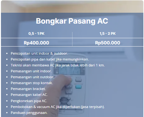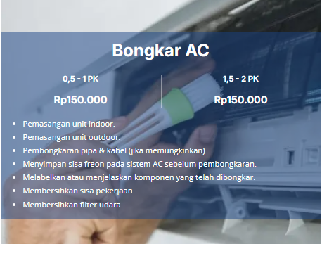 0,5 - 1 PK Rp 150.000 1,5 - 2 PK Rp150.000 Pemasangan unit indoor. Pemasangan unit outdoor. Pembongkaran pipa & kabel (jika memungkinkan). Menyimpan sisa freon pada sistem AC sebelum pembongkaran. Melabelkan atau menjelaskan komponen yang telah dibongkar. Membersihkan sisa pekerjaan. Membersihkan filter udara.
