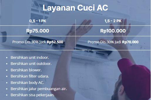 0,5 - 1 PK Rp75.000 1,5 - 2 PK Rp100.000 Bersihkan unit indoor. Bersihkan unit outdoor. Bersihkan blower. Bersihkan filter udara. Bersihkan body AC. Bersihkan jalur pembuangan air. Bersihkan sisa pekerjaan.