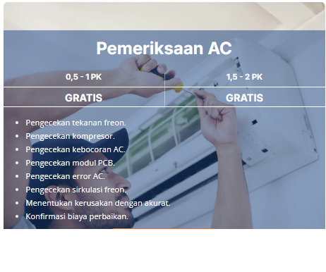 Gratis Pengecekan tekanan freon. Pengecekan kompresor. Pengecekan kebocoran AC. Pengecekan modul PCB. Pengecekan error AC. Pengecekan sirkulasi freon. Menentukan kerusakan dengan akurat. Konfirmasi biaya perbaikan.