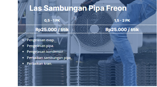 0,5 - 1 PK Rp 25.000 / titik 1,5 - 2 PK Rp25.000 / titik Pengelasan evap. Pengelasan pipa. Pengelasan kondensor. Perbaikan sambungan pipa. Perbaikan kran.