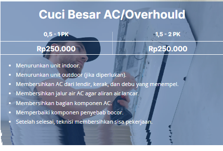 0,5 - 1 PK Rp250.000 1,5 - 2 PK Rp250.000 Menurunkan unit indoor. Menurunkan unit outdoor (jika diperlukan). Membersihkan AC dari lendir, kerak, dan debu yang menempel. Membersihkan jalur air AC agar aliran air lancar. Membersihkan bagian komponen AC. Memperbaiki komponen penyebab bocor. Setelah selesai, teknisi membersihkan sisa pekerjaan.