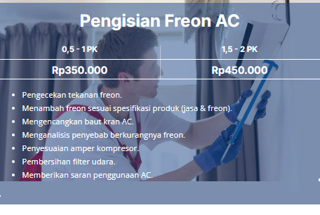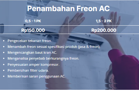 0,5 - 1 PK Rp150.000 1,5 - 2 PK Rp200.000 Pengecekan tekanan freon. Menambah freon sesuai spesifikasi produk (jasa & freon). Mengencangkan baut kran AC. Menganalisa penyebab berkurangnya freon. Penyesuaian amper kompresor. Pembersihan filter udara. Memberikan saran penggunaan AC.